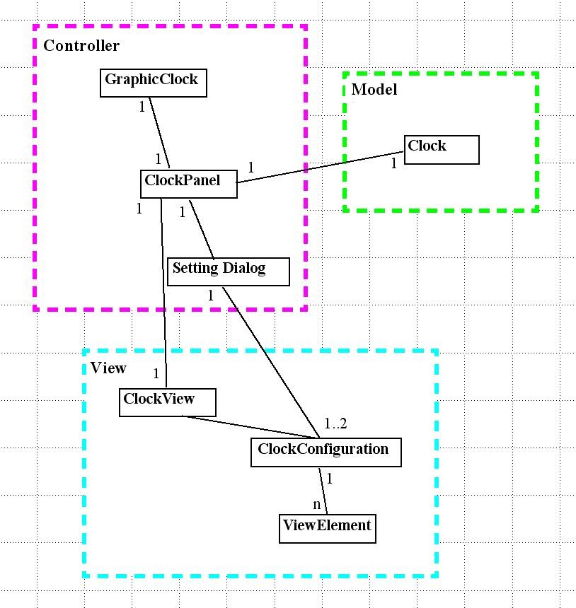 The View is the interesting part. The ClockView class is abstract, providing the interface to set a configuration and update the current time representation. The only concrete ClockView is SquarePane, which creates an array of Swing JPanels; Swing controls the layout of and generally manages the JPanels. The ClockConfiguration class aggregates the various sorts of customizations; SquarePane uses ClockConfiguration to figure how to color each JPanel in its array. The current customizations consist of layouts and color effects; these are both subclasses of ViewElement. Each customization is implemented in its own class.